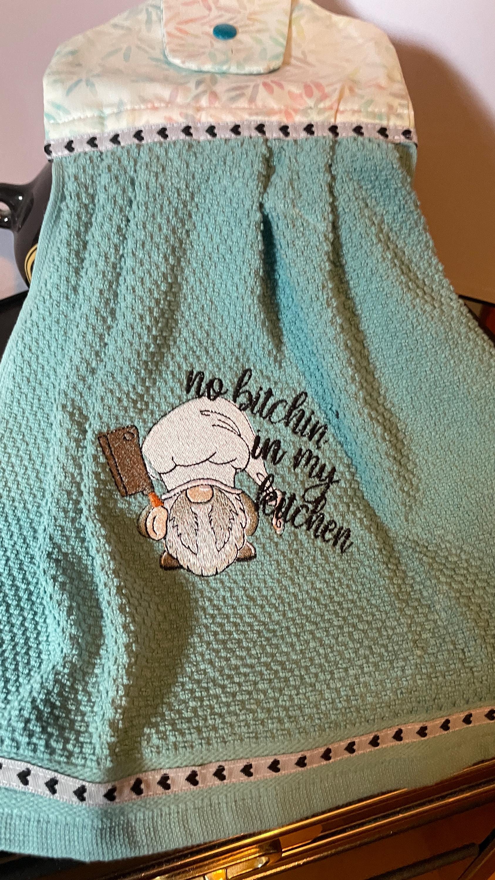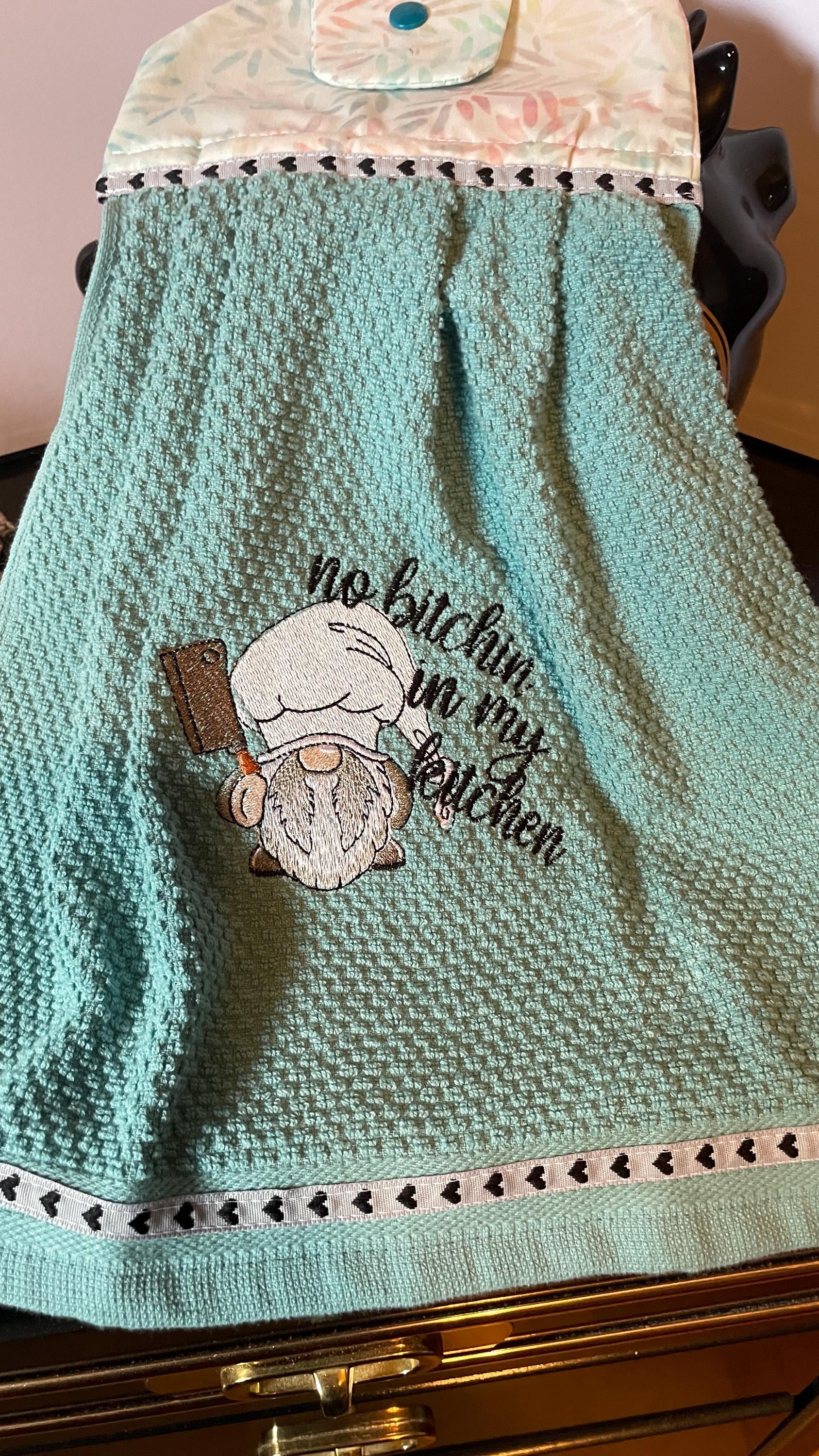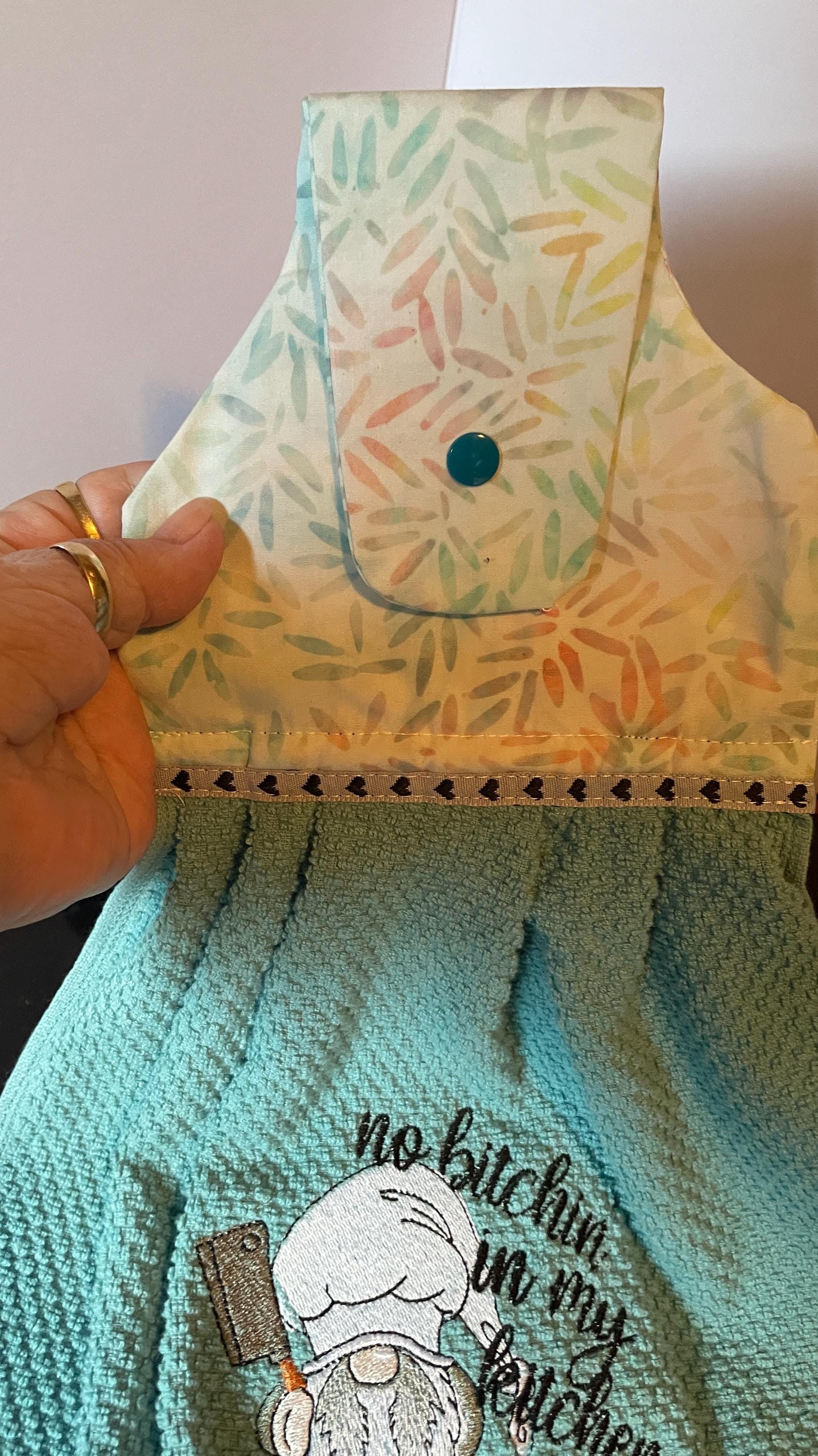White hanging dish towel for drying your hands when at the kitchen or bathroom sink.