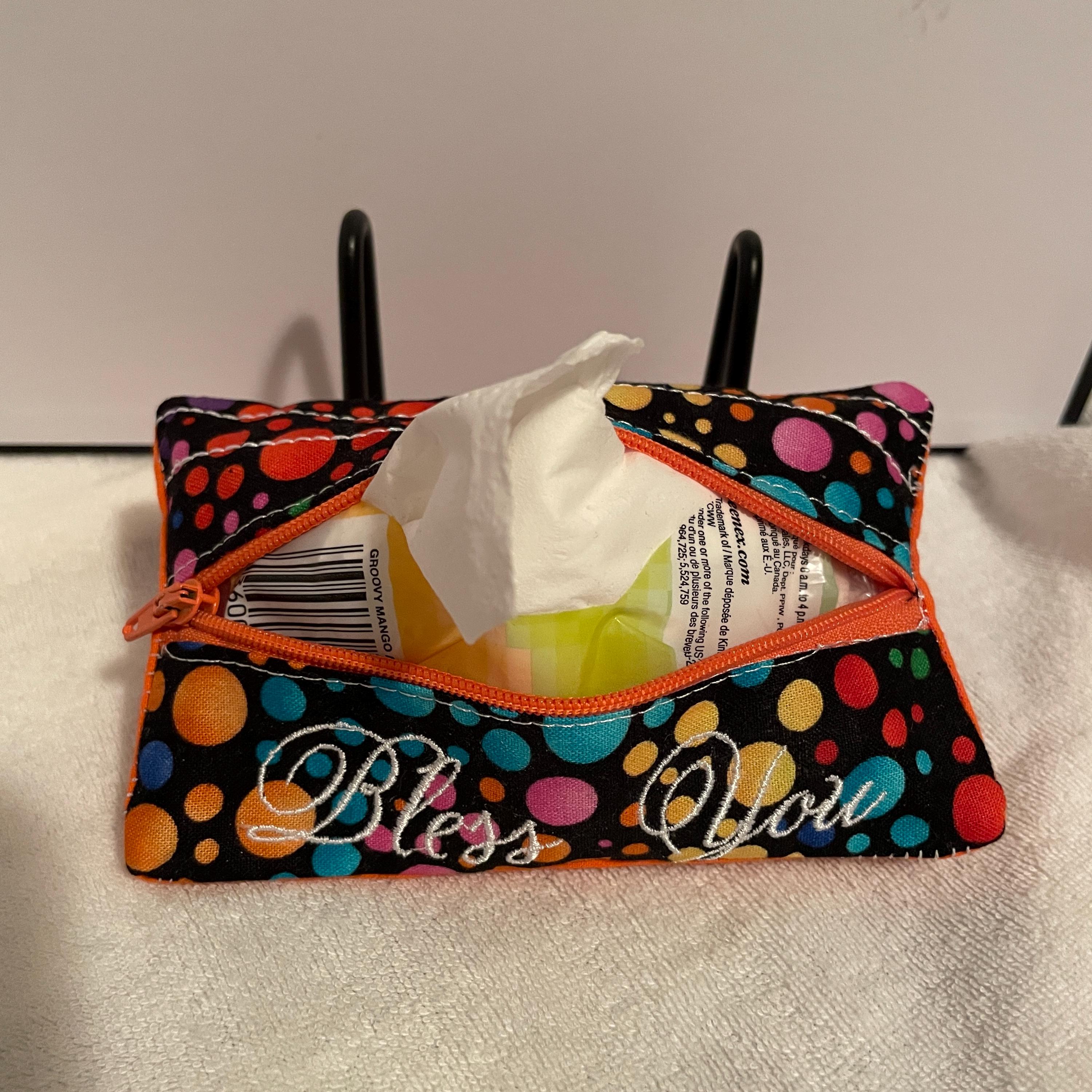 Ask a questionCustom Zippered Tissue Holder - Tissues not included in shipping. Ready to ship !! These were custom-made to order. Ready to ship immediately. Tissues not included in shipment. Carry in your purse, give as a gift, keep in your car, take with you when walking your dog, keep in your desk at work the options are unlimited. These three are one-of-a-kind, and once sold, they are gone. Others can be made but the material will be different