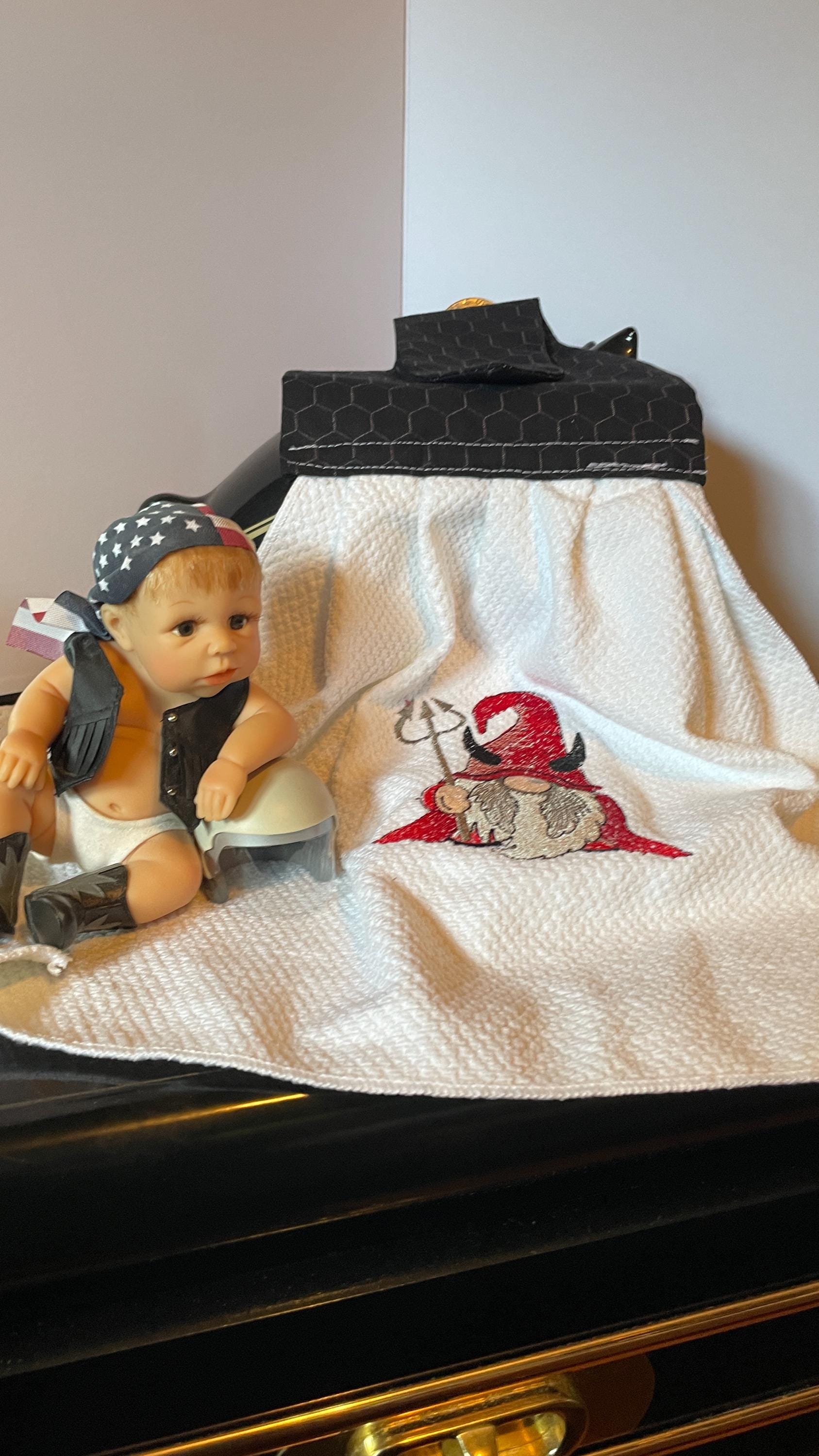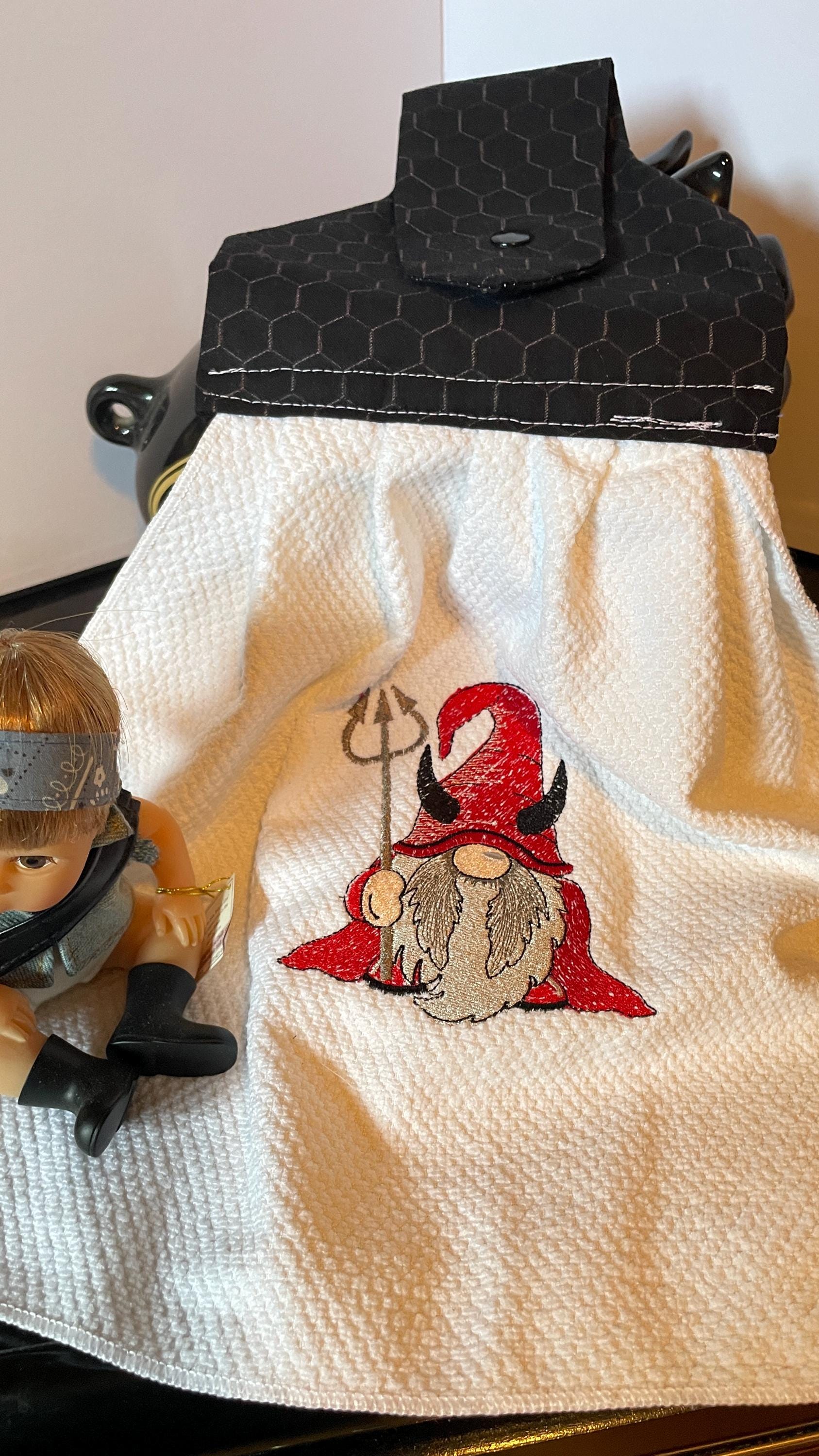 Hanging Kitchen towel Little Devil Gnome. Custom embroidery Poly Cotton Towel with top for hanging on your cabinet handle right at your sink! Great for drying hands