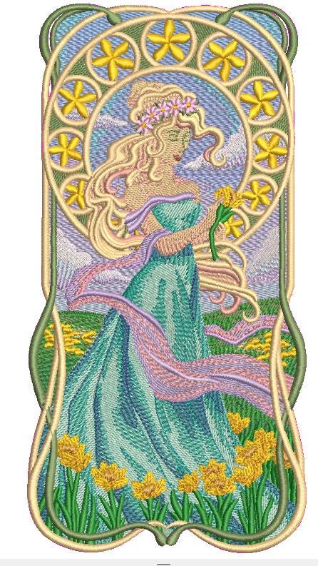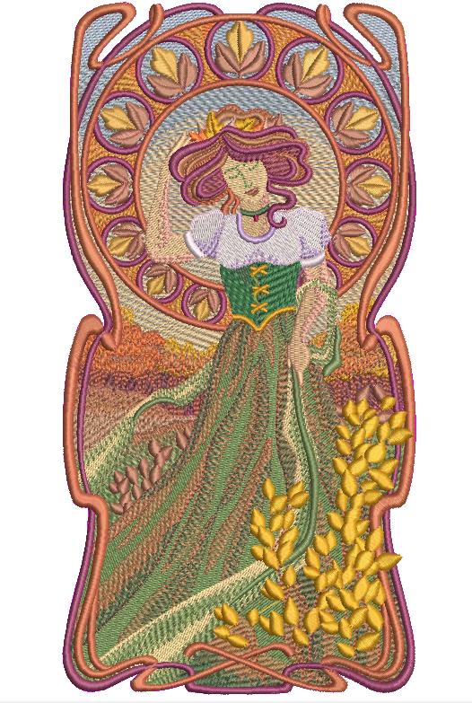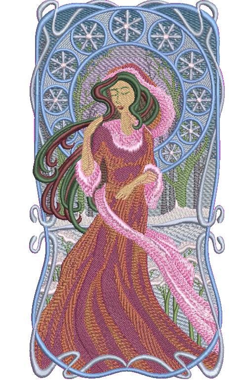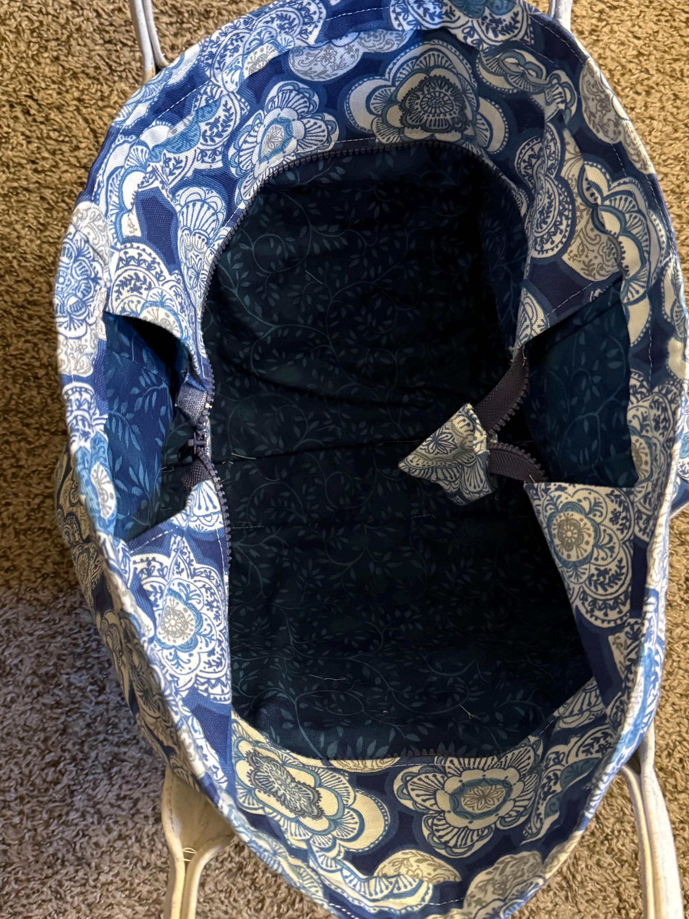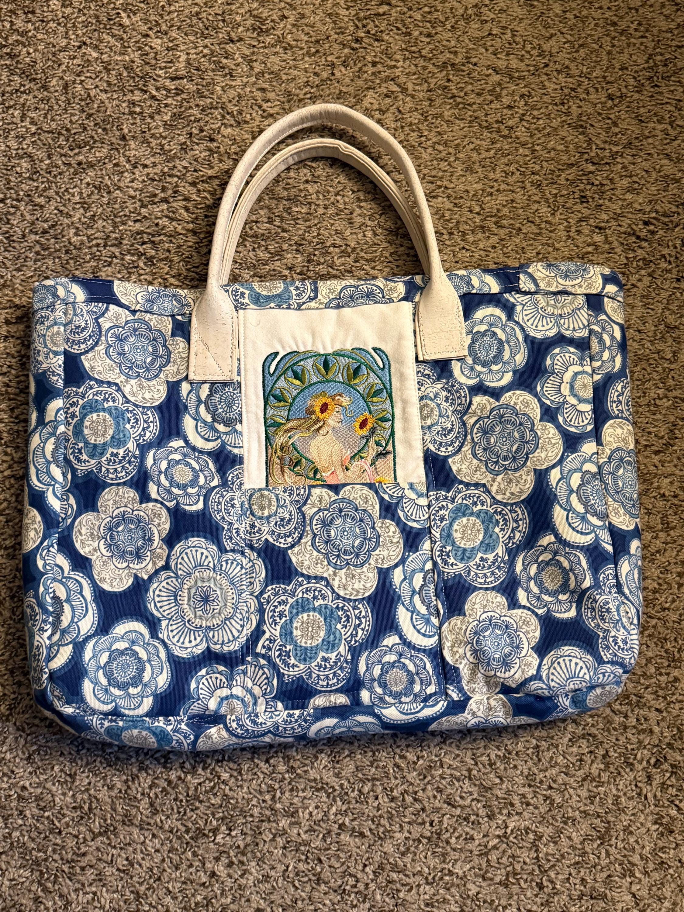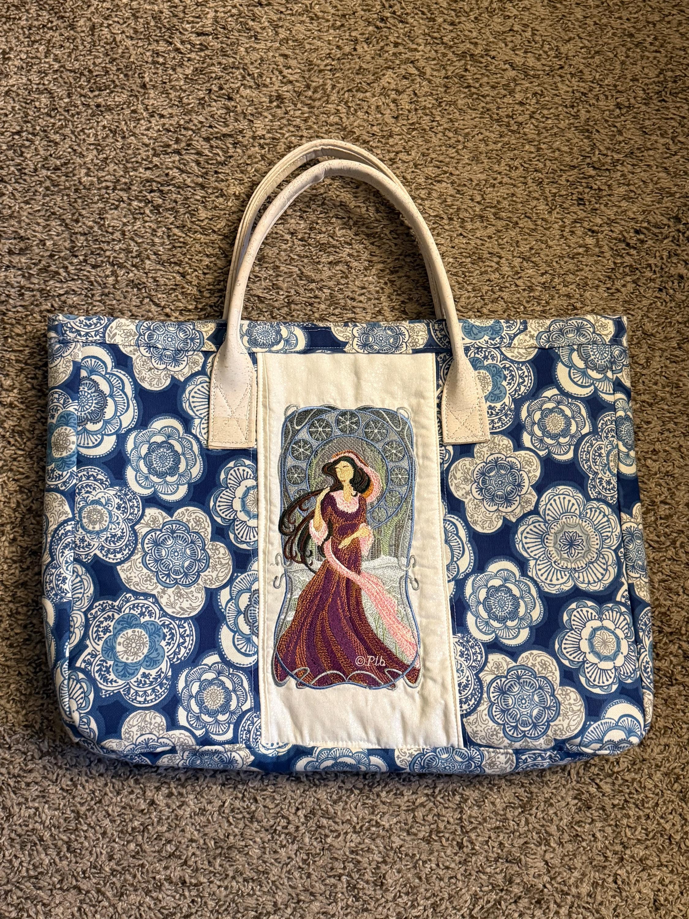Custom Embroidery Tote Bag 3 inch x 14 x 18 Tote with custom-made handles lined with an inset zipper. Fully lined and interphased. Each Embroidery Season Lady is 4.5 x 8.5, and chosen Season Lady will either be Winter, as shown, Summer, Spring, or Fall (Images available) Colors for the tote will coordinate with the Season Lady. Small Interior Bag 7.5x10" with Name fully lined for the inside made from matching interior bag fabric. This is a Custom Made Bag, made to order