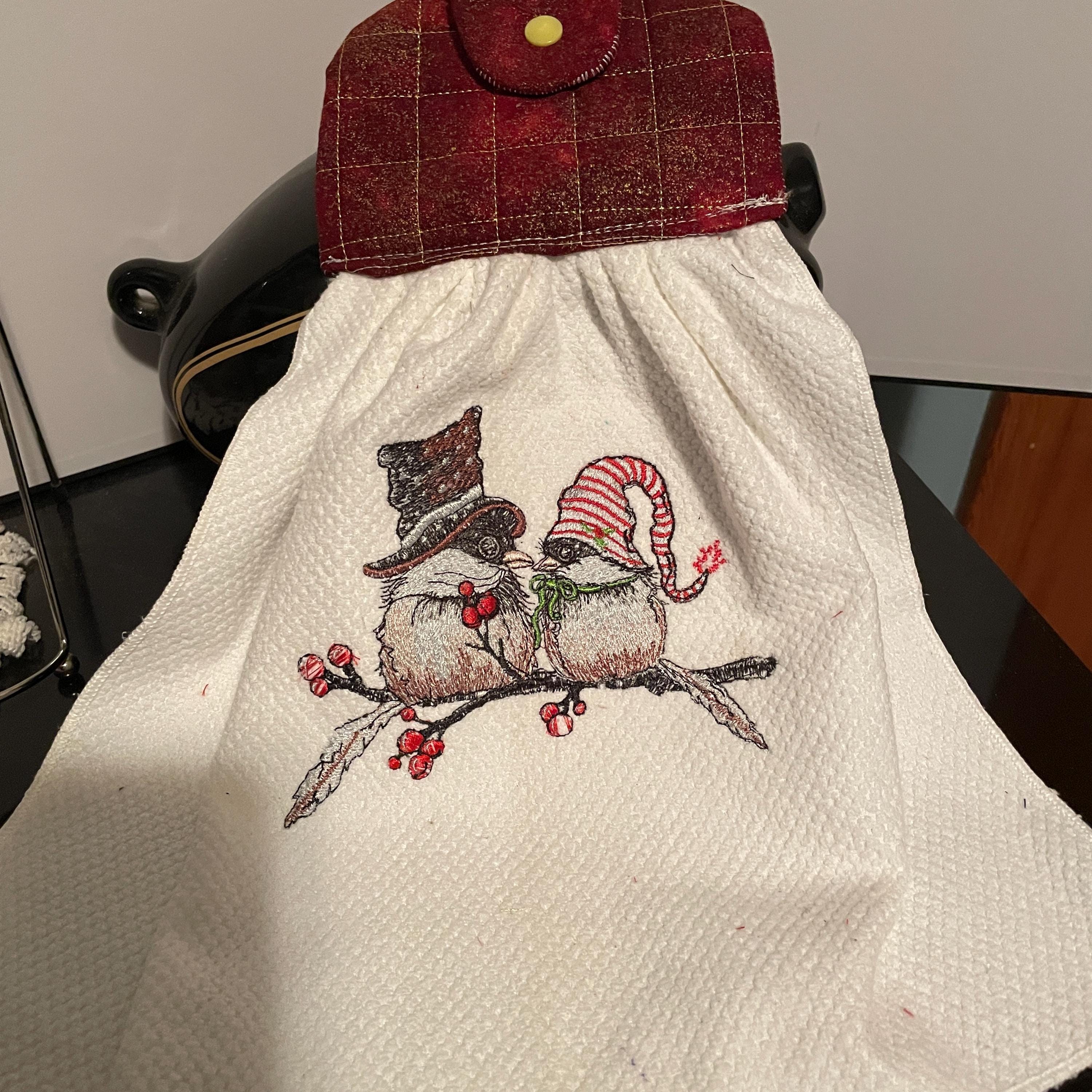 Winter Chickadees just hanging out on their branch, enjoying the day. Hanging Kitchen Towel, with quilted topper, snap closure enables it to hang on the oven door, dishwasher, or cabinet handle. Also great for Bathrooms, guest rooms. Machine Washable cotton towel and topper.